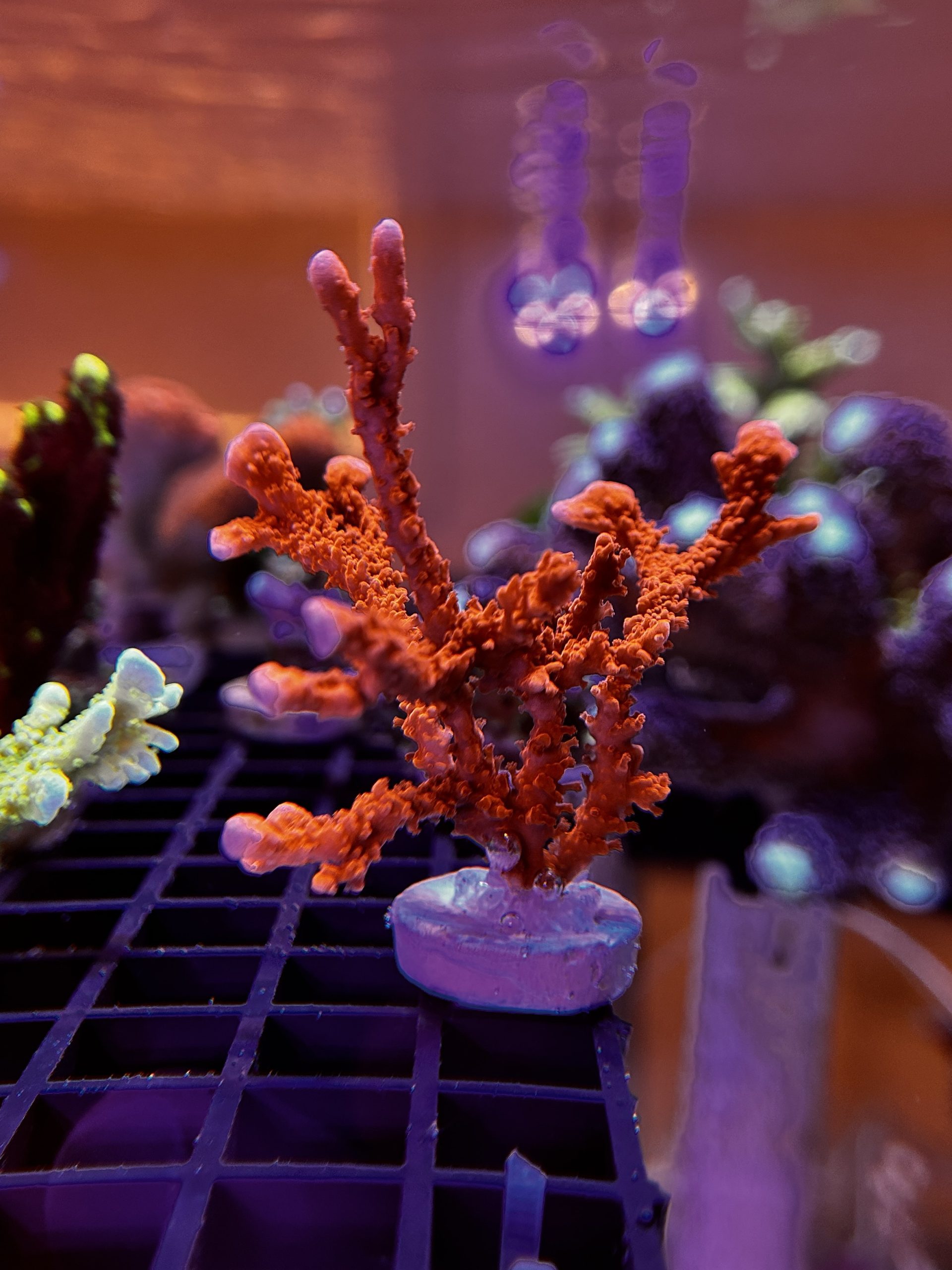 Branching Montipora from the ACI Manila Spy lineage, featuring a deep red to burnt-orange coloration with a rugged, textured growth form. Develops dense, upright branches with strong encrusting at the base and maintains warm coloration under stable reef conditions. A classic Montipora that adds structure and rich tone to SPS-dominant and mixed reef systems.