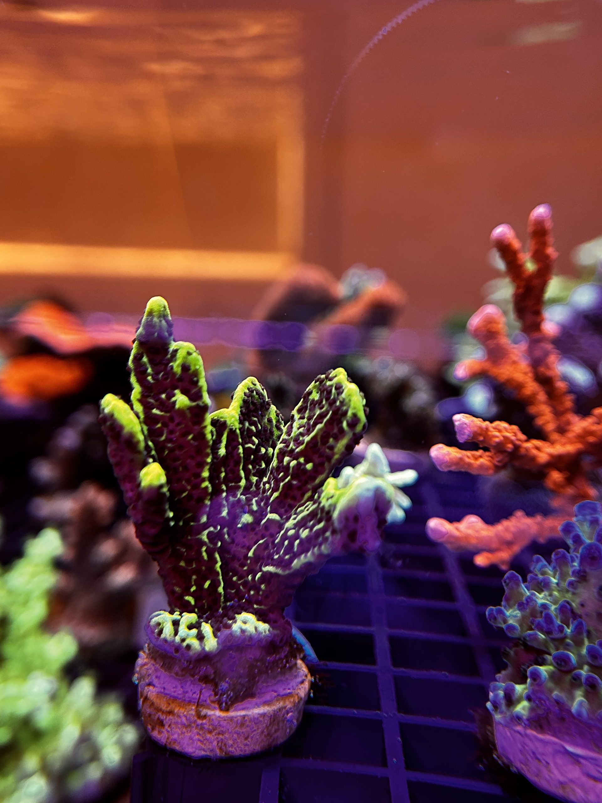 Branching Montipora with a bright green skin and darker corallite texture throughout the surface. Forms compact, upright branches with a heavily textured, almost knobby appearance. Holds solid green coloration under moderate to high light and adds strong structure and depth to SPS and mixed reef systems.