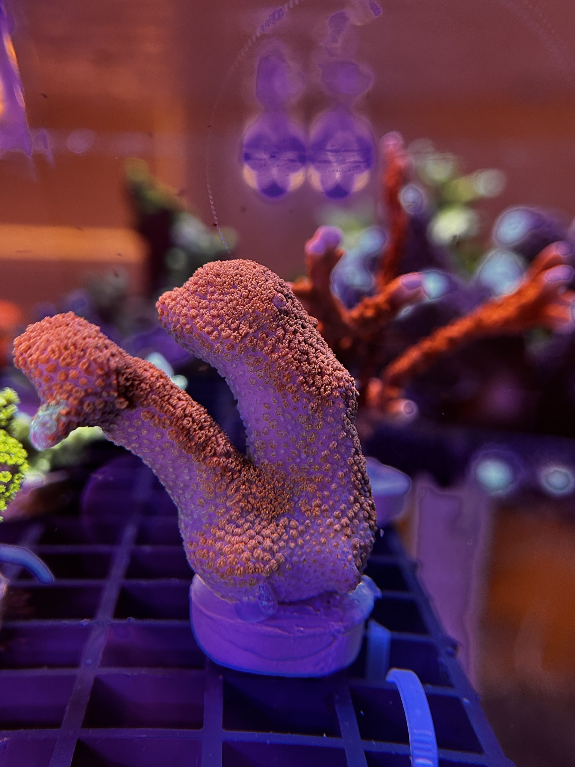 Branching Montipora digitata with a deep, earthy red coloration. Thick branching with a dense polyp texture. Forms upright, finger-like branches and encrusts well at the base before vertical growth. Less fluorescent than bright red varieties, making it a more natural, subdued accent coral that adds warm tones and structure to mixed reef and SPS systems.
